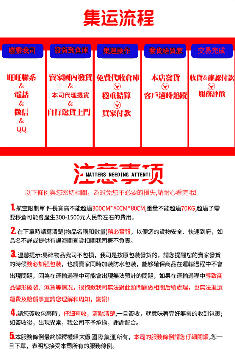 计费方式:海运根据货物具体情况分为按重量计费和按体积计费,根据【材积】判断采取何种计费方式。材数=长cm*宽cm*高cm/23817。每种类型的货物都有规定的材积重量,如果1材货物超过规定的重量则按照重量收费,如果在规定范围内则按照体积计费。海运运费虽然经济,但是海运承运物品限制较多,特货、敏感货以及杂货的数量都有严格限制,因此海运一般用于运输大批量的重货,其他类型货物主要采用空运到台湾。